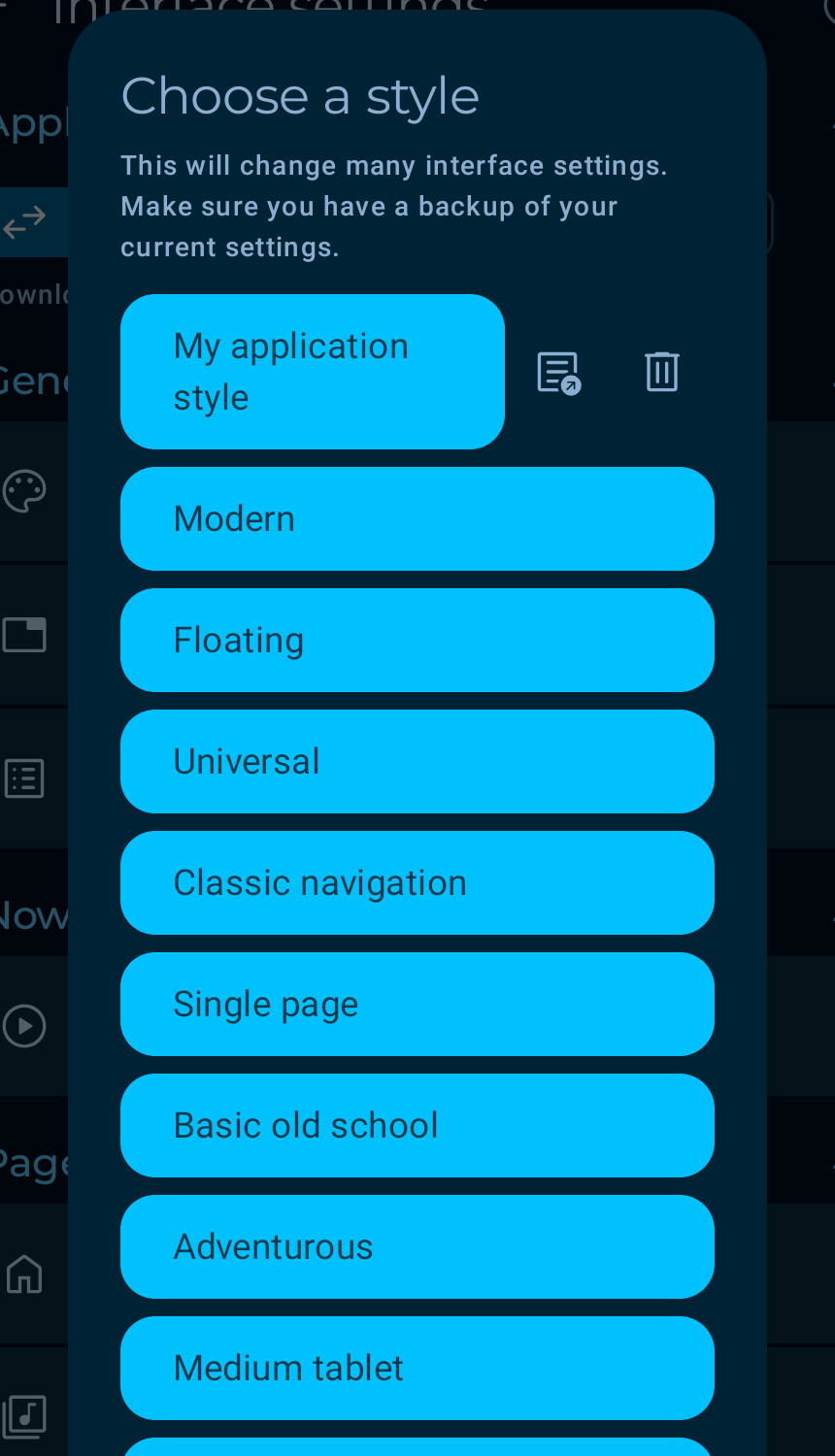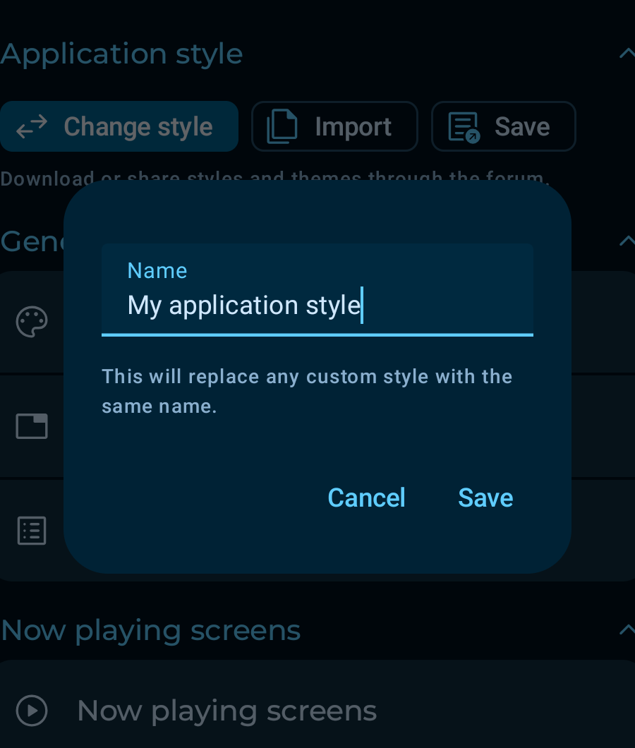 For full application styles and now playing styles, the export flow is two steps: first save the style with a name, then open Change style and tap the export button on the saved entry.