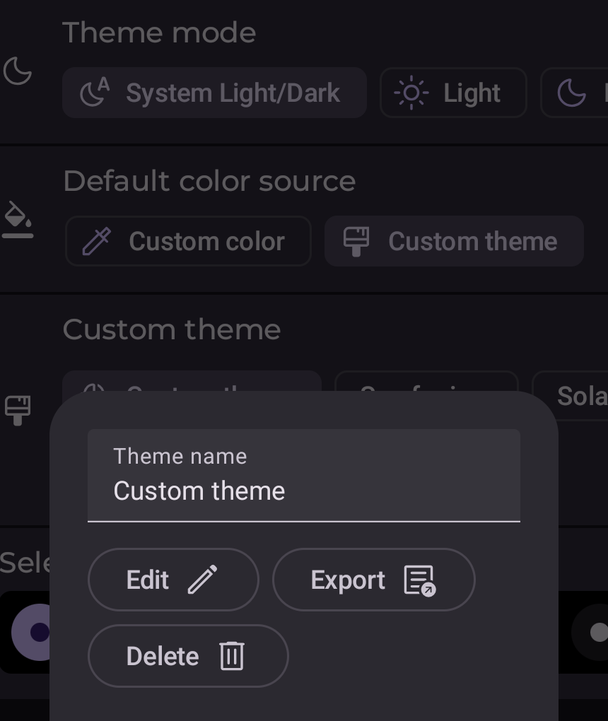 For color themes, save the theme first, then tap the theme and use the export option from the theme dialog.